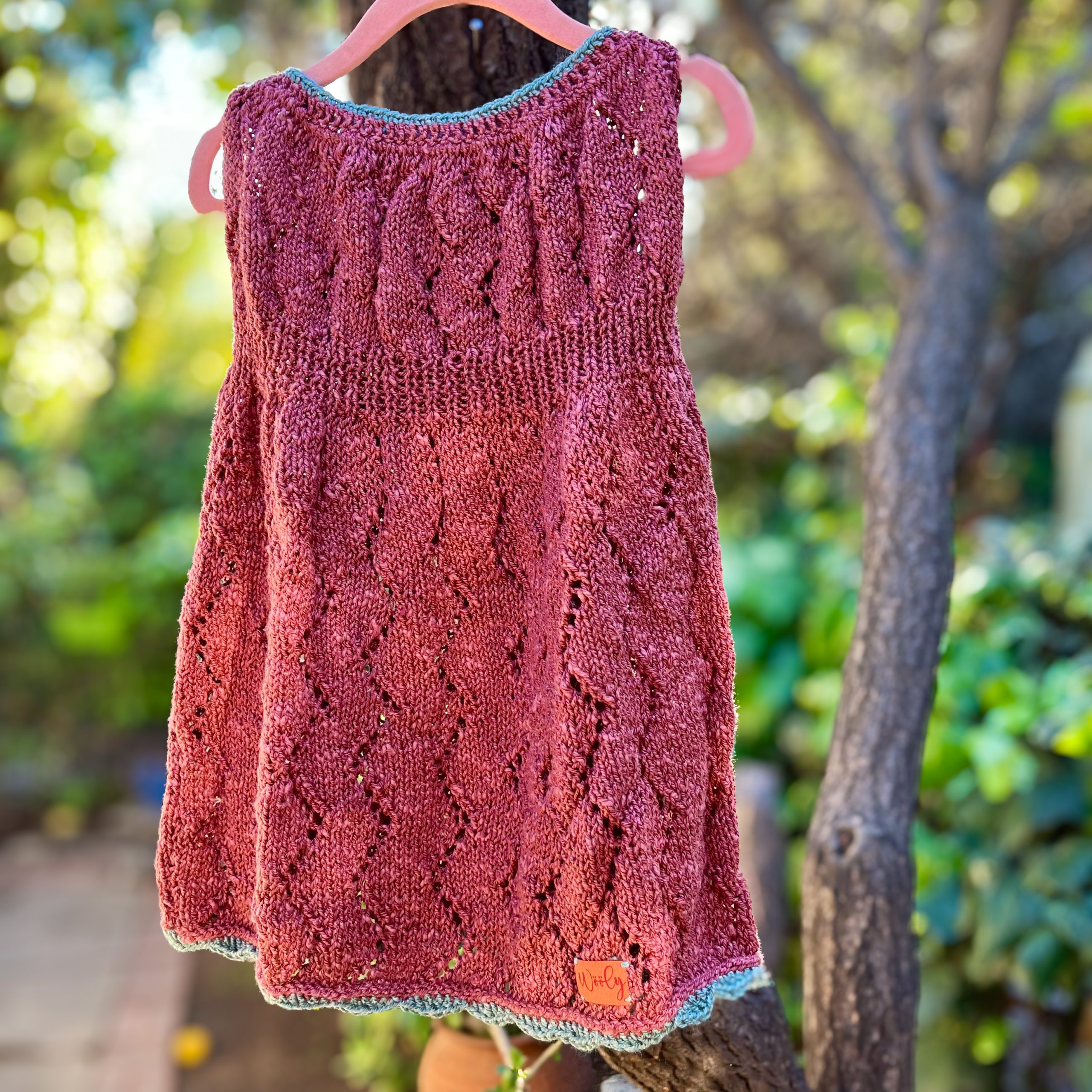 Vestido con bolero tejido a palillo, con botón en la espalda. Bordes a crochet. Color burdeo claro y gris.  Bebé de 6 a 12 meses. Primavera.