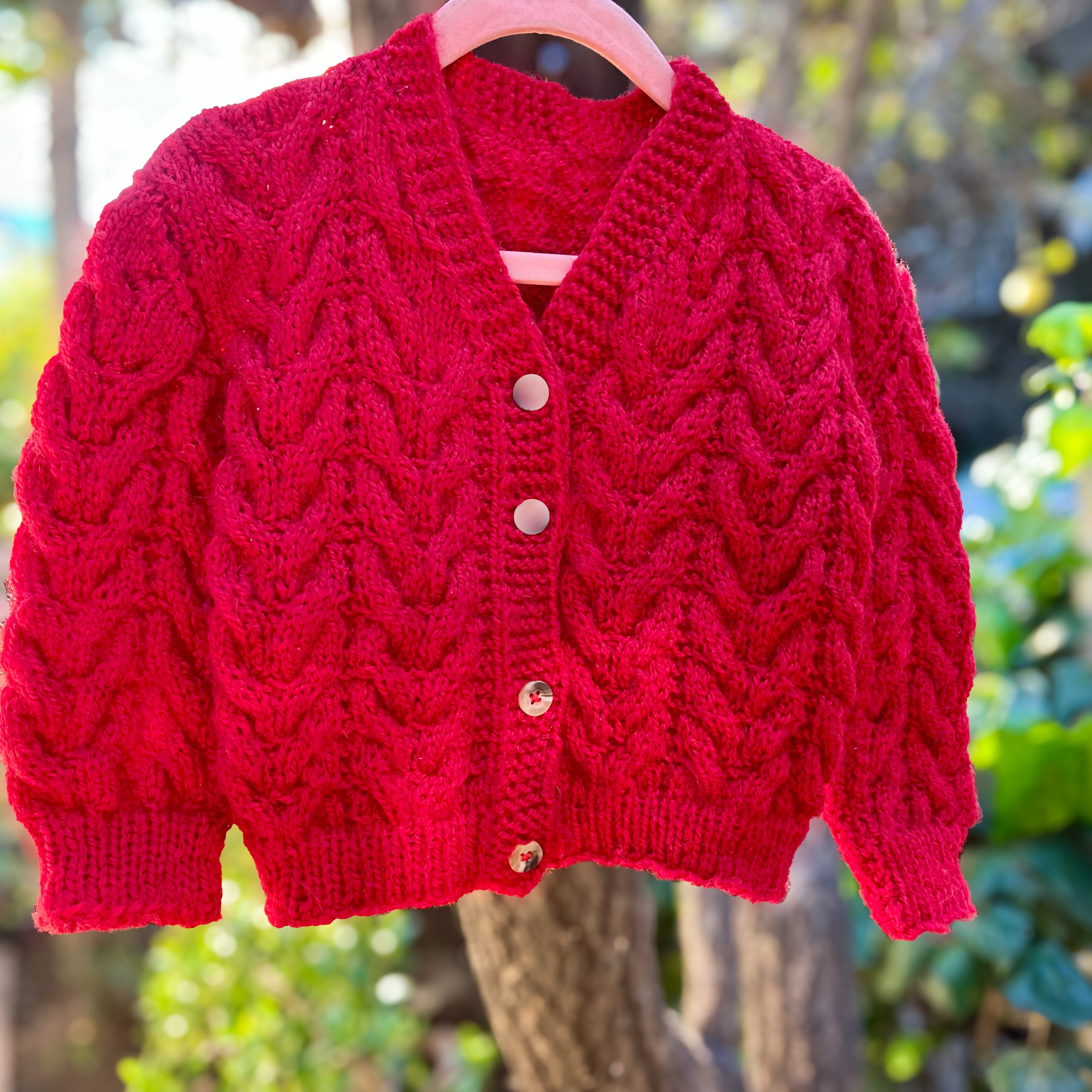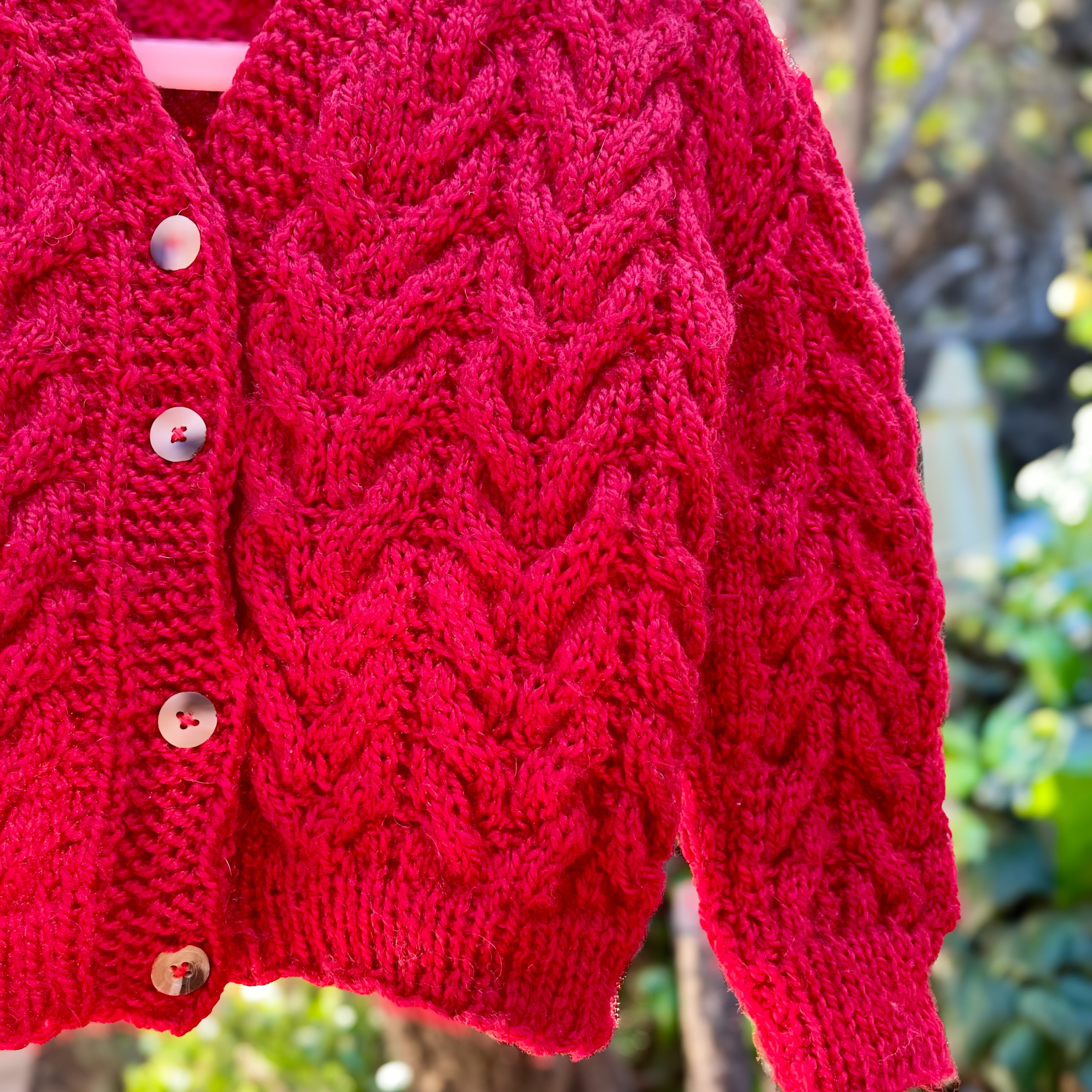 Chaleco Abotonado, manga larga, tejido a palillo. Color Rojo. Bebé de 6 a 12 meses. Otoño – Primavera.