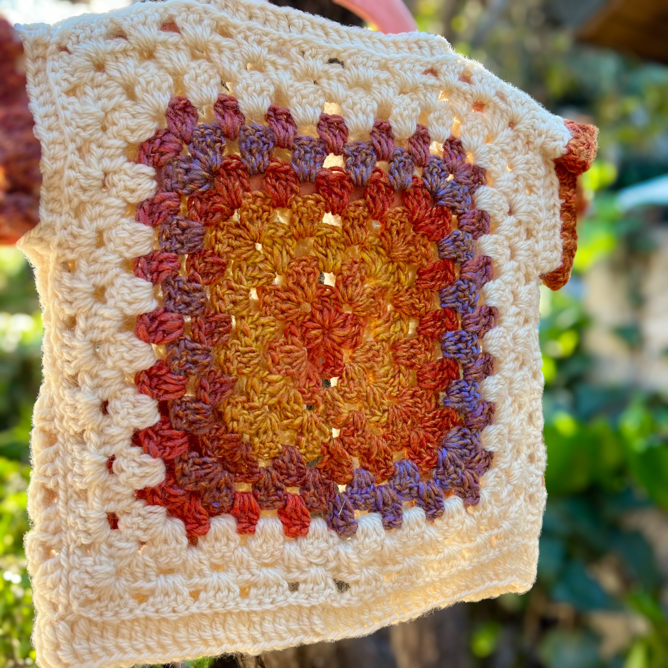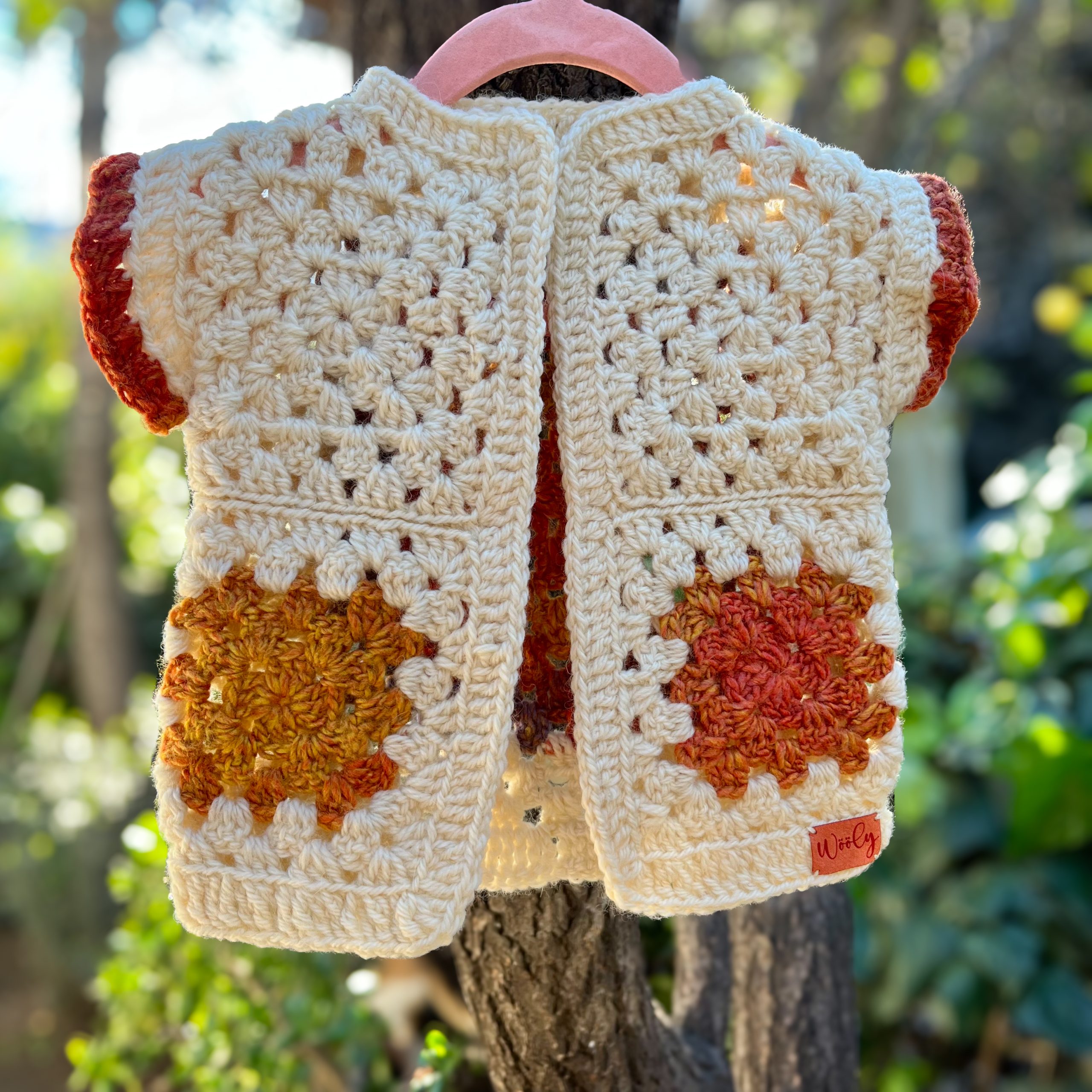 Chaleco Granny tipo Kimono tejido a crochet, sin mangas. Fibras premium. Colores Crudo, tonos naranjo degrade. Bebé de 3 a 9 meses. Primavera.